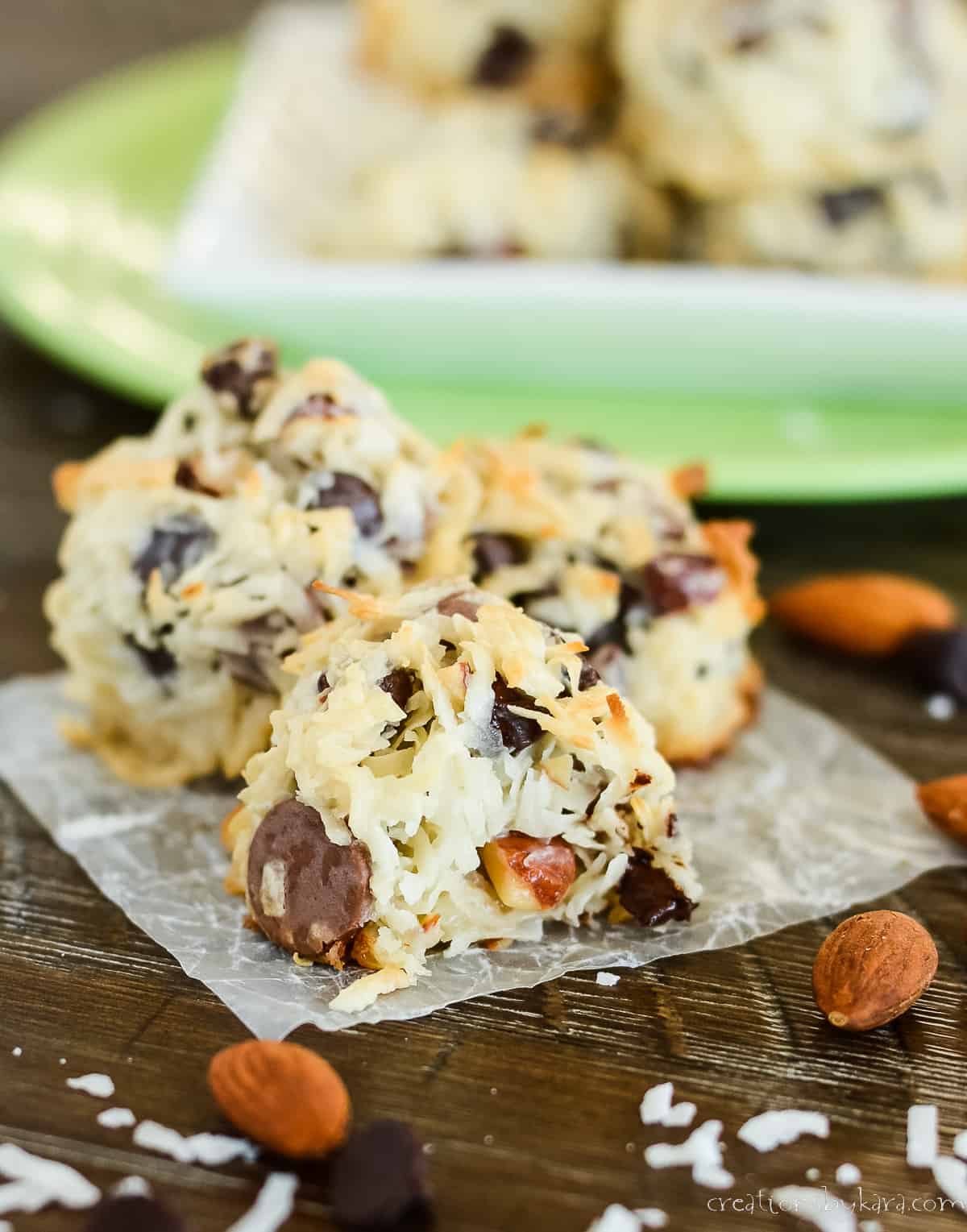 These almond coconut chocolate chip cookies are just like your favorite candy bars, but in cookie form!