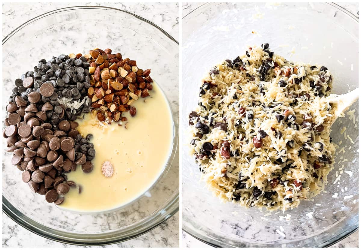 - MIX – Combine the coconut, chocolate chips, chopped almonds, sweetened condensed milk, vanilla extract, and salt in a large bowl. Stir until all the coconut flakes are well-coated.