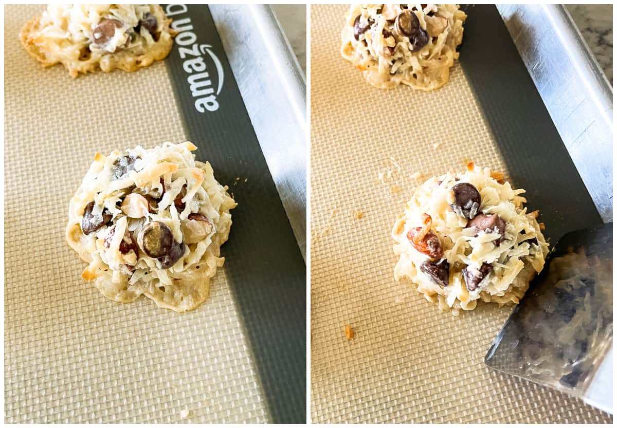 - Bake at 325° for 13-16 minutes, or until golden brown around the edges. (Some of the pieces of coconut on the tops of the cookies should be toasted.)