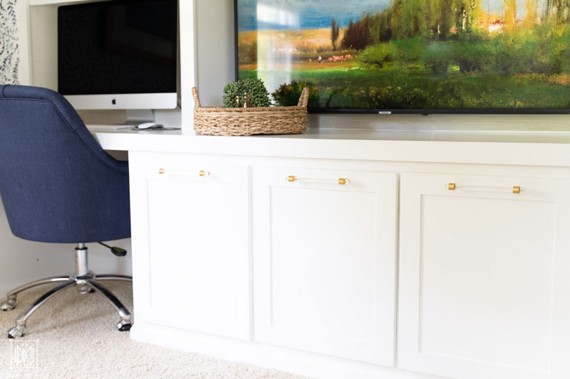 The built-ins in between the two work stations house the DVD player, the printer, and the kids iPads and kindles (and their charging station.) We added these great look for less acrylic pulls to add a little touch of glamour to them and I am in love!