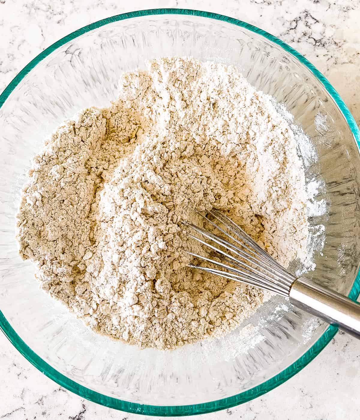 - DRY INGREDIENTS – Whisk together the blended oats, flour, baking soda, baking powder, salt, cinnamon and nutmeg in a small bowl.
